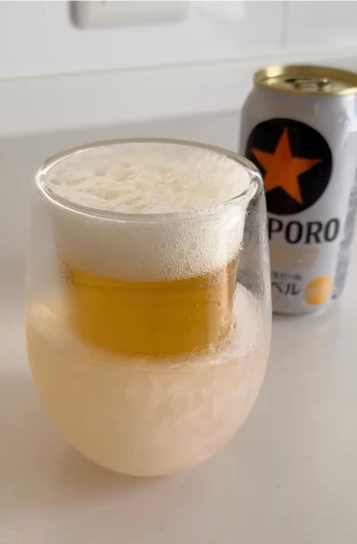 ダブルウォールグラスの中に特殊なじぇるが入っていて、凍らすと氷なしでずーっとキンキンを楽しめる最高のグラス♡